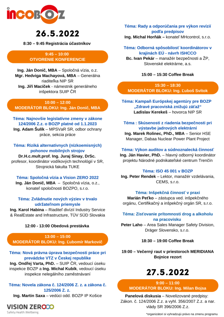 Dňa 26. – 27. mája 2022 sa uskutoční 8. ročník medzinárodnej konferencie INCOBOZ. Konferencia sa uskutoční v rezorte MERIDIANA, ktorý sa nachádza v kúpeľnom meste Bojnice. Pre účastníkov, ktorí sa nemôžu zúčastniť konferencie osobne, bude pripravený špeciálny on-line živý vstup.