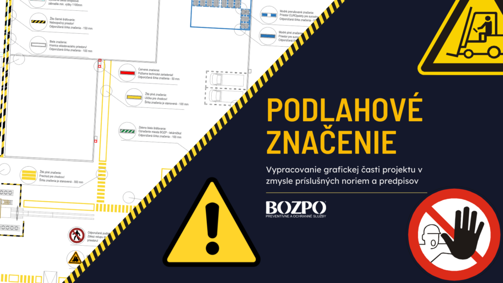 Spoločnosť BOZPO, s.r.o. ponúka vypracovanie grafickej časti projektu podlahového bezpečnostného značenia vo výrobných priestoroch, skladoch, priemyselných prevázkach, logistických priestoroch a mnoho ďalších priestoroch, ktoré vyžadujú dôraz na zvýšenú bezpečnosť a ochranu zdravia pri práci. Bezpečnostné značenie je vypracované v zmysle príslušných noriem, predpisov a charakteru prevádzky.