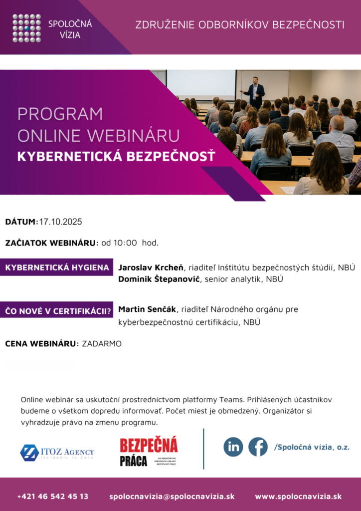 15 septembra, 2025in Domáceby admin581 Online webinár Kybernetická bezpečnosť registrácia Ukončená Ďakujeme za veľký záujem o webinár. Kapacita bola naplnená. Pripravujeme pre vás aj ďalšie zaujímavé webináre. Sledujte našu stránku.