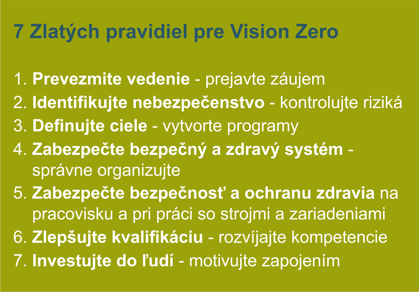 Zlepšenie bezpečnosti a ochrany zdravia v podniku nemusí nevyhnutne znamenať zvýšenie výdavkov. Dôležitejšie je, že manažment koná s vedomím, vedie konzistentne a buduje atmosféru dôvery a otvorenej komunikácie na všetkých úrovniach spoločnosti. Realizácia stratégie prevencie v rámci Vision Zero vyžaduje aktívny príspevok a účasť mnohých rôznych aktérov na úrovni spoločnosti. Jedna vec je jasná: úspech alebo zlyhanie pri implementácii stratégie Vision Zero budú v konečnom dôsledku určovať angažovaní zamestnávatelia a riaditelia, motivovaní manažéri a ostražití zamestnanci.